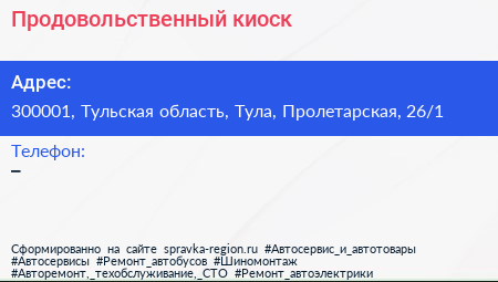 Продовольственный киоск по адресу 300001, Тульская область, Тула, Пролетарская, 26/1 в дальнейшем Организация, размещена в следующих категориях: