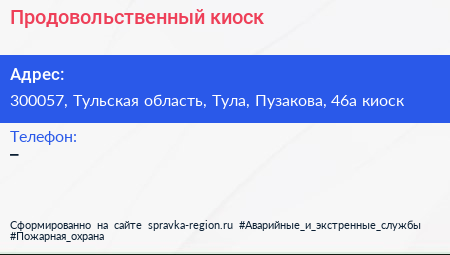 Продовольственный киоск по адресу 300057, Тульская область, Тула, Пузакова, 46а киоск в дальнейшем Организация, размещена в следующих категориях: