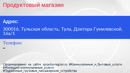 Продуктовый магазин по адресу 300016, Тульская область, Тула, Доктора Гумилевской, 16а/1 в дальнейшем Организация, размещена в следующих категориях: