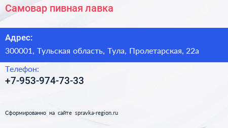 Самовар, пивная лавка по адресу 300001, Тульская область, Тула, Пролетарская, 22а в дальнейшем Организация, размещена в следующих категориях: