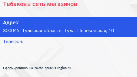 Табаковъ, сеть магазинов по адресу 300045, Тульская область, Тула, Перекопская, 10 в дальнейшем Организация, размещена в следующих категориях: