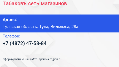 Табаковъ, сеть магазинов по адресу Тульская область, Тула, Вильямса, 28а в дальнейшем Организация, размещена в следующих категориях: