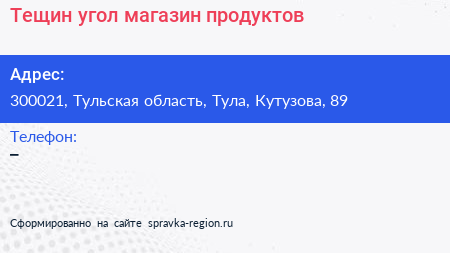 Тещин угол, магазин продуктов по адресу 300021, Тульская область, Тула, Кутузова, 89 в дальнейшем Организация, размещена в следующих категориях: