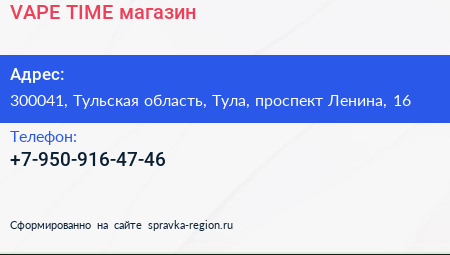 VAPE TIME, магазин по адресу 300041, Тульская область, Тула, проспект Ленина, 16 в дальнейшем Организация, размещена в следующих категориях: