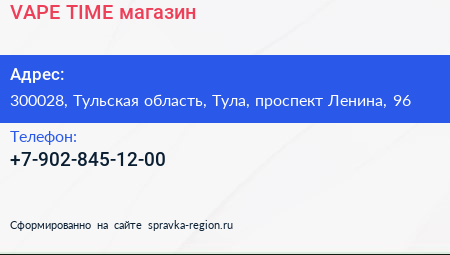 VAPE TIME, магазин по адресу 300028, Тульская область, Тула, проспект Ленина, 96 в дальнейшем Организация, размещена в следующих категориях: