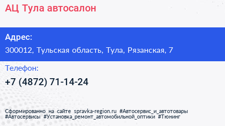 АЦ Тула, автосалон по адресу 300012, Тульская область, Тула, Рязанская, 7 в дальнейшем Организация, размещена в следующих категориях: