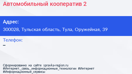 Автомобильный кооператив №2 по адресу 300028, Тульская область, Тула, Оружейная, 39 в дальнейшем Организация, размещена в следующих категориях: