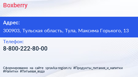 Boxberry по адресу 300903, Тульская область, Тула, Максима Горького, 13 в дальнейшем Организация, размещена в следующих категориях: