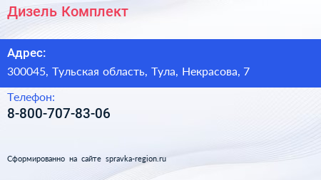 Дизель Комплект по адресу 300045, Тульская область, Тула, Некрасова, 7 в дальнейшем Организация, размещена в следующих категориях: