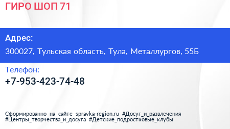 ГИРО-ШОП 71 по адресу 300027, Тульская область, Тула, Металлургов, 55Б в дальнейшем Организация, размещена в следующих категориях: