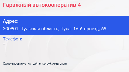 Гаражный автокооператив №4 по адресу 300901, Тульская область, Тула, 16-й проезд, 69 в дальнейшем Организация, размещена в следующих категориях: