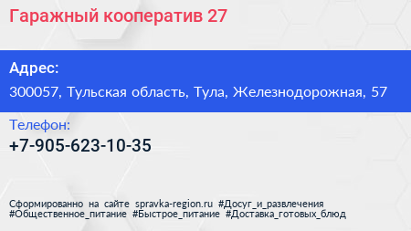 Гаражный кооператив №27 по адресу 300057, Тульская область, Тула, Железнодорожная, 57 в дальнейшем Организация, размещена в следующих категориях: