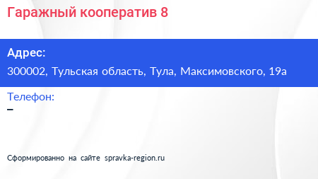 Гаражный кооператив №8 по адресу 300002, Тульская область, Тула, Максимовского, 19а в дальнейшем Организация, размещена в следующих категориях: