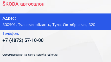 ŠKODA, автосалон по адресу 300901, Тульская область, Тула, Октябрьская, 320 в дальнейшем Организация, размещена в следующих категориях:
