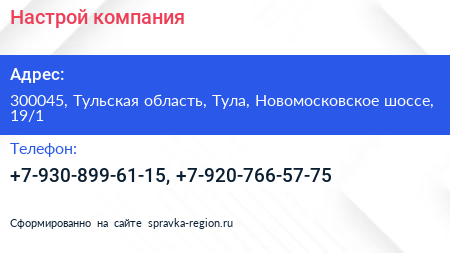 Настрой, компания по адресу 300045, Тульская область, Тула, Новомосковское шоссе, 19/1 в дальнейшем Организация, размещена в следующих категориях: