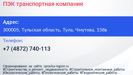 ПЭК, транспортная компания по адресу 300005, Тульская область, Тула, Чмутова, 158в в дальнейшем Организация, размещена в следующих категориях: