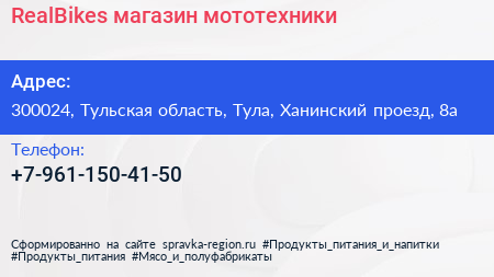 RealBikes, магазин мототехники по адресу 300024, Тульская область, Тула, Ханинский проезд, 8а в дальнейшем Организация, размещена в следующих категориях: