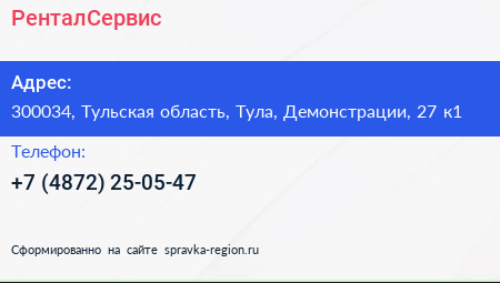 РенталСервис по адресу 300034, Тульская область, Тула, Демонстрации, 27 к1 в дальнейшем Организация, размещена в следующих категориях: