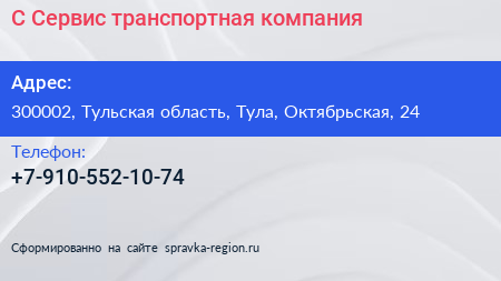 С-Сервис, транспортная компания по адресу 300002, Тульская область, Тула, Октябрьская, 24 в дальнейшем Организация, размещена в следующих категориях: