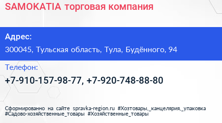 SAMOKATIA, торговая компания по адресу 300045, Тульская область, Тула, Будённого, 94 в дальнейшем Организация, размещена в следующих категориях: