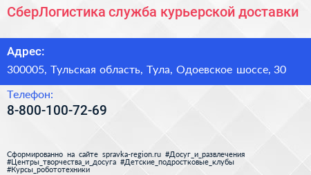 СберЛогистика, служба курьерской доставки по адресу 300005, Тульская область, Тула, Одоевское шоссе, 30 в дальнейшем Организация, размещена в следующих категориях: