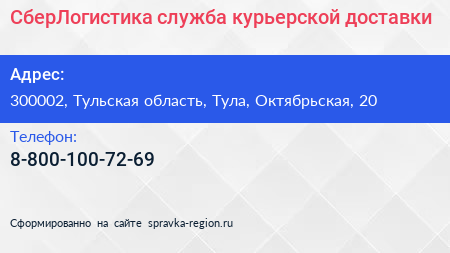 СберЛогистика, служба курьерской доставки по адресу 300002, Тульская область, Тула, Октябрьская, 20 в дальнейшем Организация, размещена в следующих категориях: