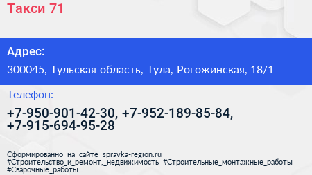 Такси 71 по адресу 300045, Тульская область, Тула, Рогожинская, 18/1 в дальнейшем Организация, размещена в следующих категориях: