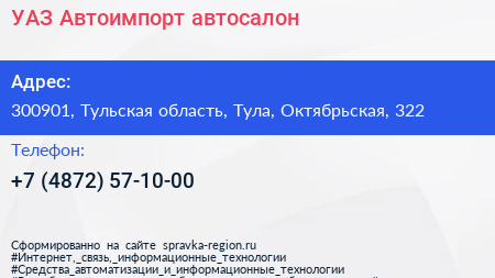 УАЗ Автоимпорт, автосалон по адресу 300901, Тульская область, Тула, Октябрьская, 322 в дальнейшем Организация, размещена в следующих категориях: