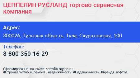 ЦЕППЕЛИН РУСЛАНД, торгово-сервисная компания по адресу 300026, Тульская область, Тула, Скуратовская, 100 в дальнейшем Организация, размещена в следующих категориях: