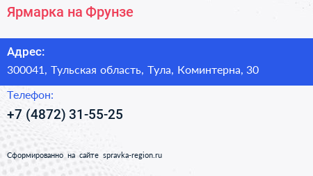 Ярмарка на Фрунзе по адресу 300041, Тульская область, Тула, Коминтерна, 30 в дальнейшем Организация, размещена в следующих категориях: