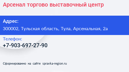 Арсенал, торгово-выставочный центр по адресу 300002, Тульская область, Тула, Арсенальная, 2а в дальнейшем Организация, размещена в следующих категориях: