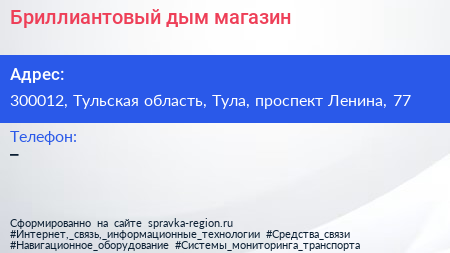 Бриллиантовый дым, магазин по адресу 300012, Тульская область, Тула, проспект Ленина, 77 в дальнейшем Организация, размещена в следующих категориях: