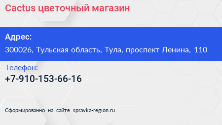 Cactus, цветочный магазин по адресу 300026, Тульская область, Тула, проспект Ленина, 110 в дальнейшем Организация, размещена в следующих категориях: