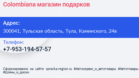 Colombiana, магазин подарков по адресу 300041, Тульская область, Тула, Каминского, 24в в дальнейшем Организация, размещена в следующих категориях: