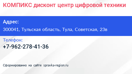 КОМПИКС, дисконт-центр цифровой техники по адресу 300041, Тульская область, Тула, Советская, 23в в дальнейшем Организация, размещена в следующих категориях: