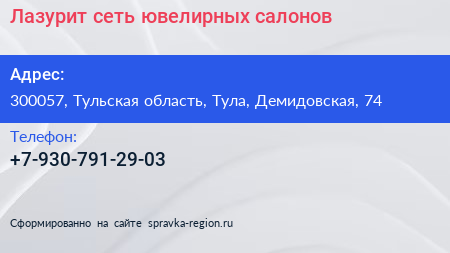 Лазурит, сеть ювелирных салонов по адресу 300057, Тульская область, Тула, Демидовская, 74 в дальнейшем Организация, размещена в следующих категориях: