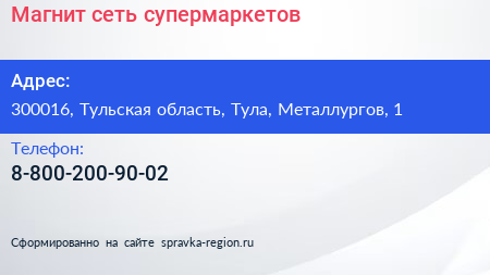 Магнит, сеть супермаркетов по адресу 300016, Тульская область, Тула, Металлургов, 1 в дальнейшем Организация, размещена в следующих категориях: