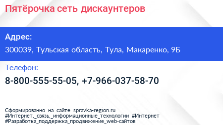 Пятёрочка, сеть дискаунтеров по адресу 300039, Тульская область, Тула, Макаренко, 9Б в дальнейшем Организация, размещена в следующих категориях: