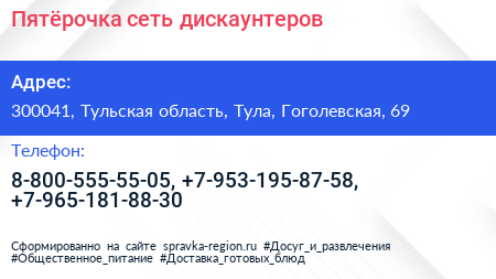 Пятёрочка, сеть дискаунтеров по адресу 300041, Тульская область, Тула, Гоголевская, 69 в дальнейшем Организация, размещена в следующих категориях: