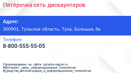 Пятёрочка, сеть дискаунтеров по адресу 300901, Тульская область, Тула, Большая, 8а в дальнейшем Организация, размещена в следующих категориях: