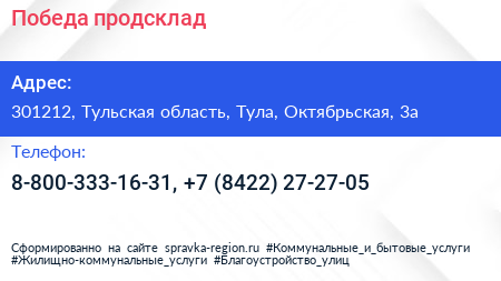 Победа, продсклад по адресу 301212, Тульская область, Тула, Октябрьская, 3а в дальнейшем Организация, размещена в следующих категориях: