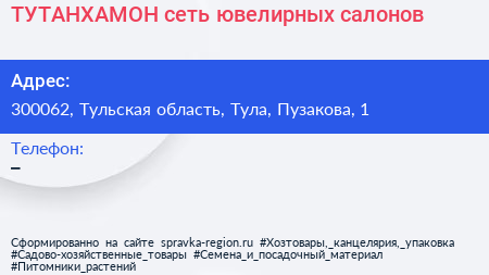 ТУТАНХАМОН, сеть ювелирных салонов по адресу 300062, Тульская область, Тула, Пузакова, 1 в дальнейшем Организация, размещена в следующих категориях: