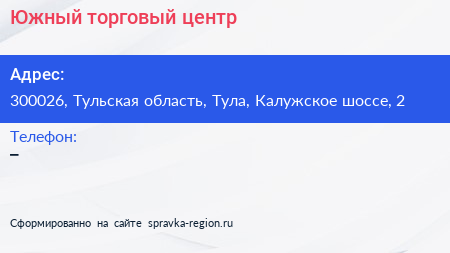 Южный, торговый центр по адресу 300026, Тульская область, Тула, Калужское шоссе, 2 в дальнейшем Организация, размещена в следующих категориях: