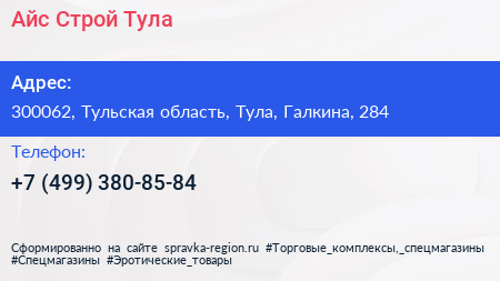 Айс-Строй Тула по адресу 300062, Тульская область, Тула, Галкина, 284 в дальнейшем Организация, размещена в следующих категориях: