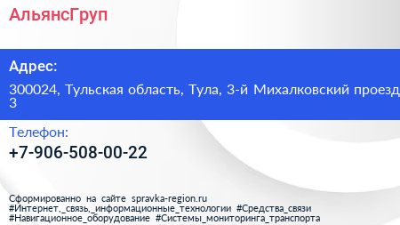 АльянсГруп по адресу 300024, Тульская область, Тула, 3-й Михалковский проезд, 3 в дальнейшем Организация, размещена в следующих категориях: