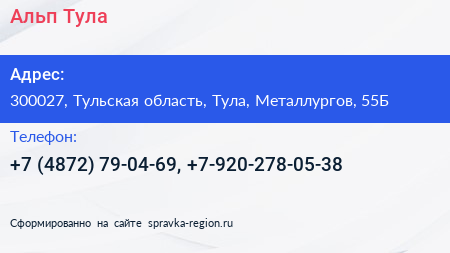 Альп Тула по адресу 300027, Тульская область, Тула, Металлургов, 55Б в дальнейшем Организация, размещена в следующих категориях: