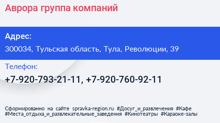 Аврора, группа компаний по адресу 300034, Тульская область, Тула, Революции, 39 в дальнейшем Организация, размещена в следующих категориях: