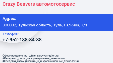 Crazy Beavers, автомотосервис по адресу 300002, Тульская область, Тула, Галкина, 7/1 в дальнейшем Организация, размещена в следующих категориях: