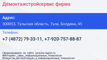 Демонтажстройсервис, фирма по адресу 300013, Тульская область, Тула, Болдина, 45 в дальнейшем Организация, размещена в следующих категориях: