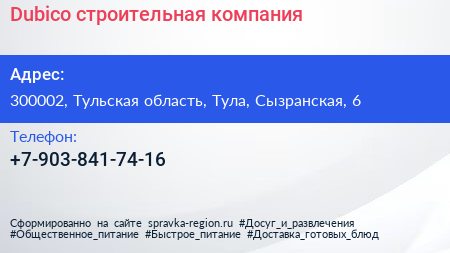 Dubico, строительная компания по адресу 300002, Тульская область, Тула, Сызранская, 6 в дальнейшем Организация, размещена в следующих категориях: